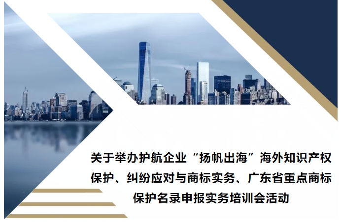• 關(guān)于舉辦護航企業(yè)“揚帆出海”海外知識產(chǎn)權(quán)保護、糾紛應對與商標實務(wù)、廣東省重點商標保護名錄申報實務(wù)培訓會活動